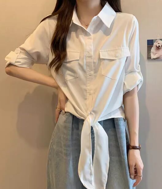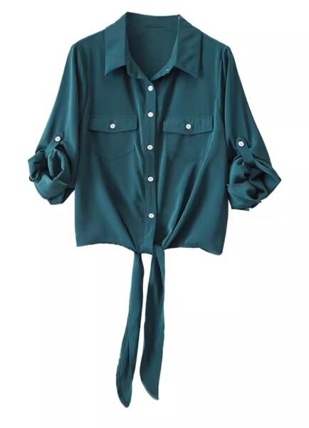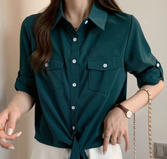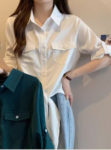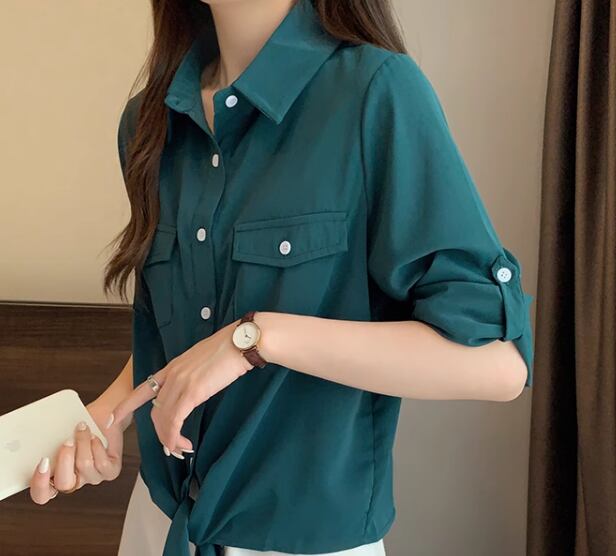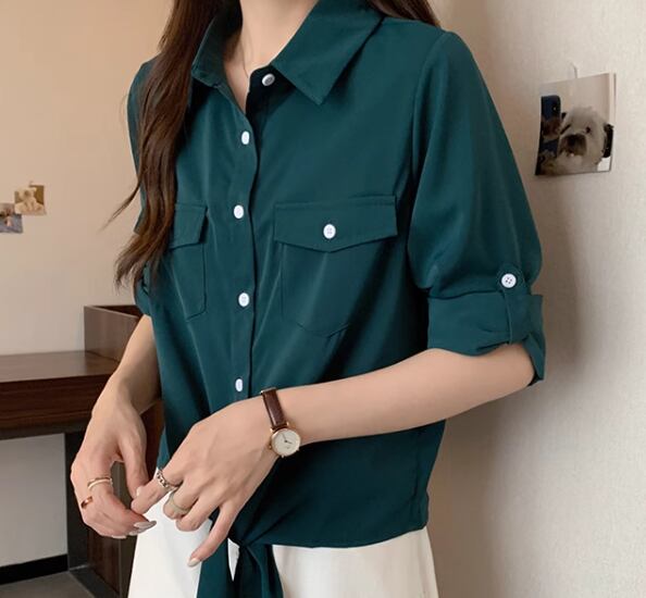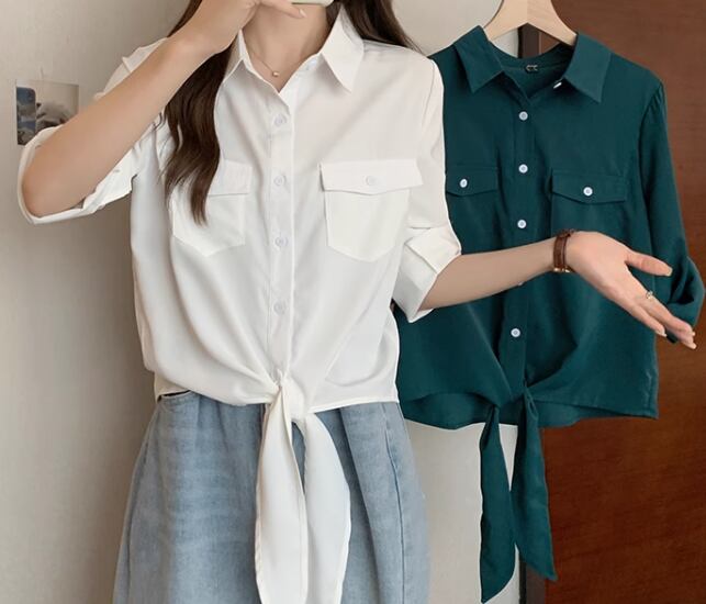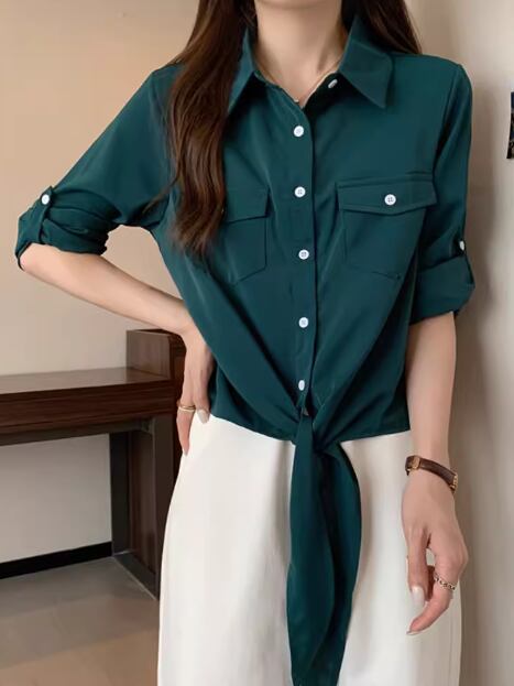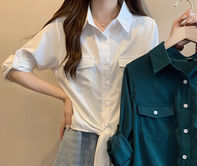 レディース トップス シャツ ショート 長袖 ロールアップ 襟付き ポロカラー 前開き ボタン 大人可愛い きれいめ シンプル カジュアル 上品 おしゃれ かっこいい こなれ感 ボーイッシュ クール エレガント ナチュラル 知的 清潔感 爽やか ハンサム シック 高級感 スタイリッシュ 無地 夏 デート お出かけ 普段使い 着回し M L XL ゆったり ホワイト グリーン