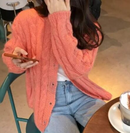 中厚手のニット素材で、伸縮性があり着心地も抜群。カジュアルから上品まで幅広いスタイリングに対応し、主役級の存在感を演出します。ケーブルニットパターンが施され、カントリー風やナチュラルスタイルにも相性抜群です。