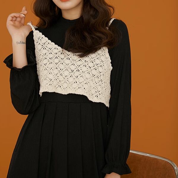 かぎ針編みキャミとワンピの2点セットアイテム。ショート丈キャミと長袖ロングワンピのシンプルな組み合わせが演出する洗練されたスタイルをお楽しみください。柔らかな素材で着心地も抜群。キャミとワンピを別々に着用することもでき、着回しの幅が広がります。貴女のトレンド感のあるおしゃれなコーディネートのために是非オススメしたい逸品です。