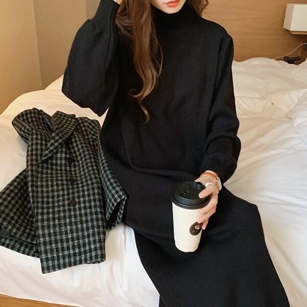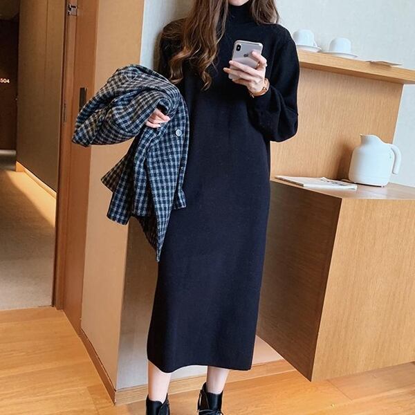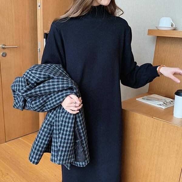 2色展開 レディースワンピース セーターニットドレス ニット プルオーバー ドレス ロングスカート ミッドウエスト ロング 長袖 ハーフハイカラー ワイド ストレート フォーマル ベルベット 無地 20代 30代 春 秋 オフィス ビジネス ショッピング カフェ 暖かい 体型カバー 通勤 レジャー大きめ