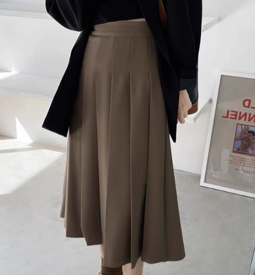 落ち着いた色味が大人っぽいミモレ丈のプリーツスカート。