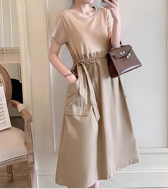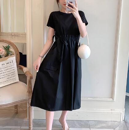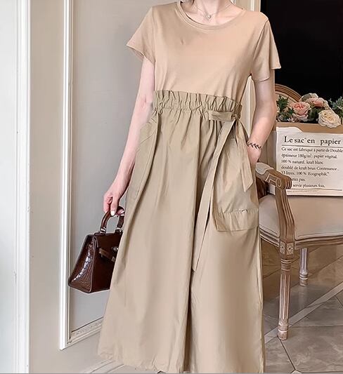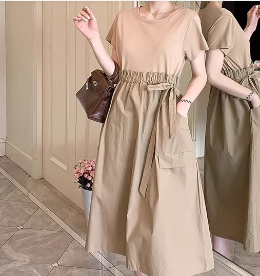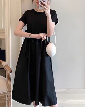 フェイクツーピース レディース ワンピース プルオーバー 膝下 ミモレ 半袖 ラウンドネック ウエストマーク 切り替えデザイン ドッキング かわいい 大人可愛い きれいめ シンプル カジュアル 上品 おしゃれ レトロ ガーリー 個性的 キュート ナチュラル シック 優しい 穏やか 無地 夏 デート お出かけ 体型カバー 普段使い 清楚 M L XL ゆったり ブラック ブラウン
