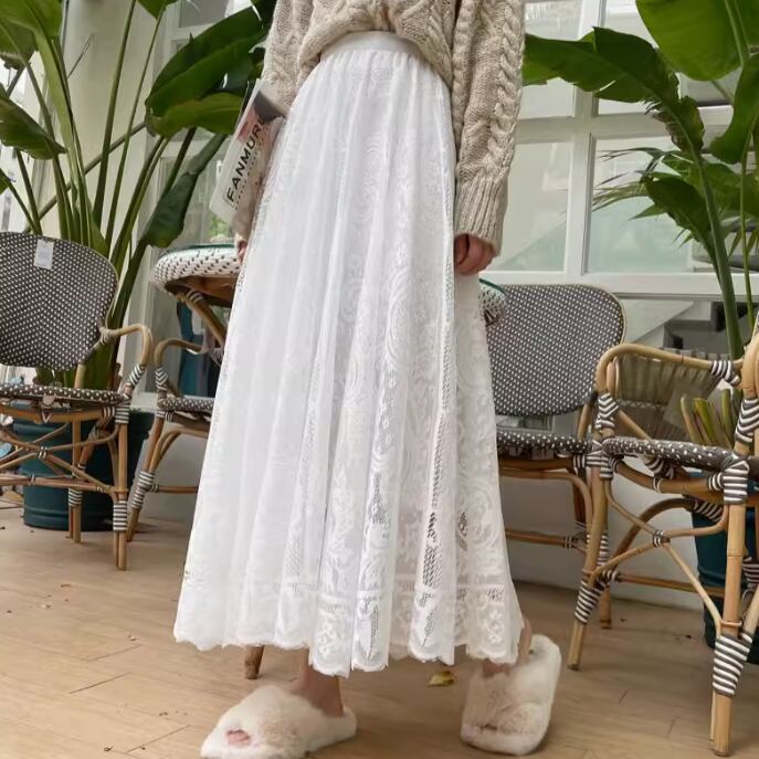 レディース スカート フレアスカート ロングスカート 膝下 ロング マキシ Aライン フェミニン レース ウエストゴム 透け感 シースルー 薄手 かわいい 大人可愛い きれいめ 上品 おしゃれ エキゾチック こなれ感 ガーリー エレガント 主役級 存在感 とろみ感 抜け感 ラブリー キュート プリンセス ロマンティック 春 夏 ロングシーズン 学生 デート お出かけ イベント 旅行 女子会 休日 ガーデン ショッピング コンサート ライブ カフェ 普段使い 着回し モテ ホワイト ブラック アプリコット