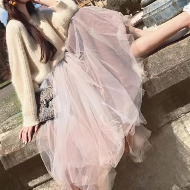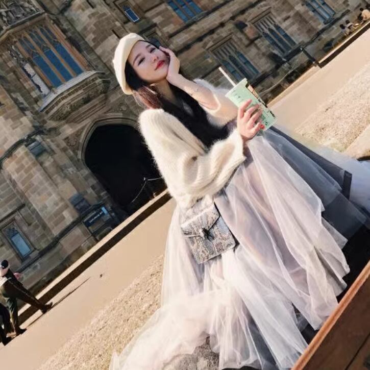 ふわふわのニットと透け感のあるスカートで