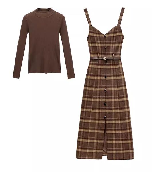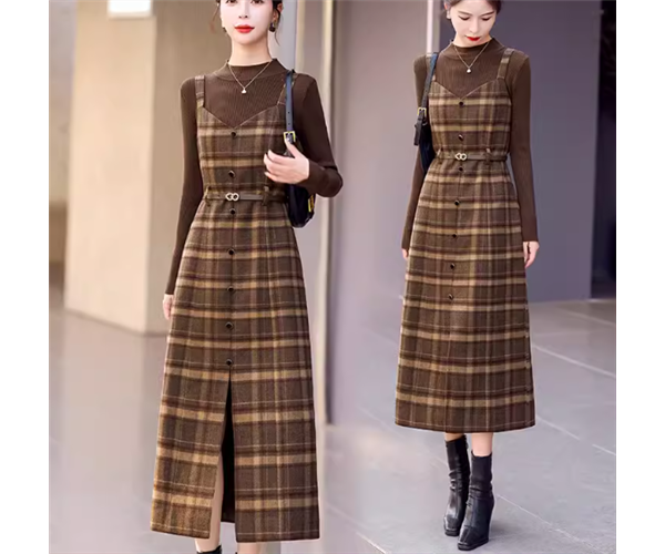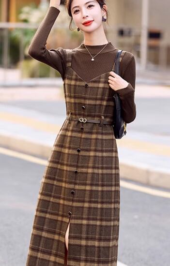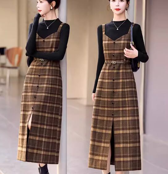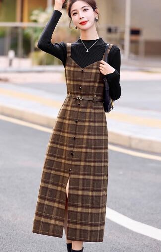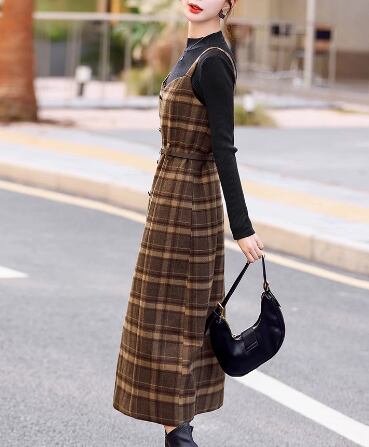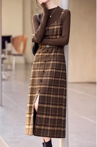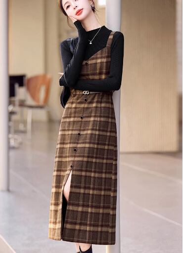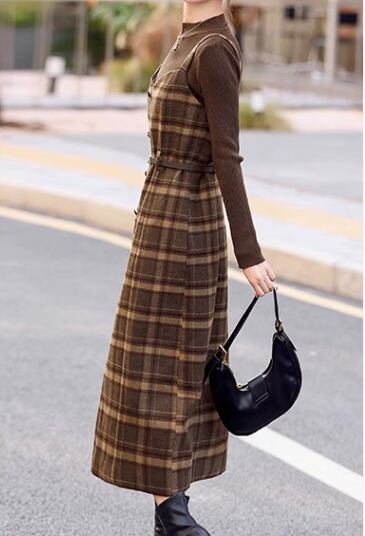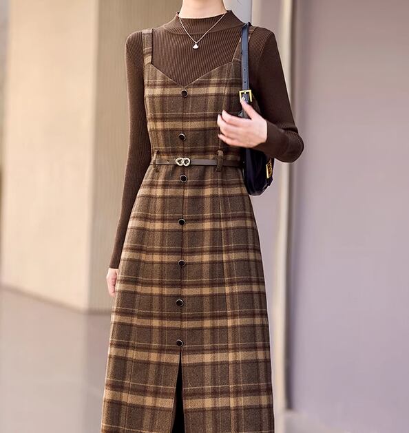 二点セット ツーピース レディース トップス ワンピース プルオーバー セットアップ ウール ロングスカート 長袖 ラウンドネック Aライン ベルト ウエストマーク ファスナー ハイウエスト 大人可愛い きれいめ シンプル カジュアル 上品 おしゃれ レトロ エレガント クラシカル ナチュラル 知的 シック 高級感 スタイリッシュ チェック 春 秋 デート お出かけ 重ね着 普段使い 着回し レイヤード 清楚 M L XL ブラック ブラウン