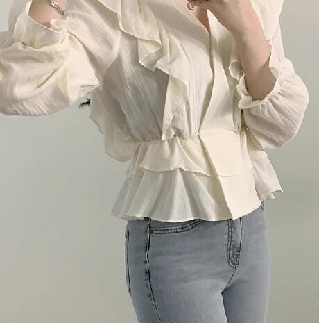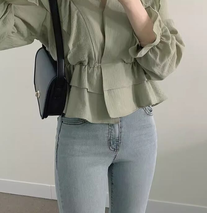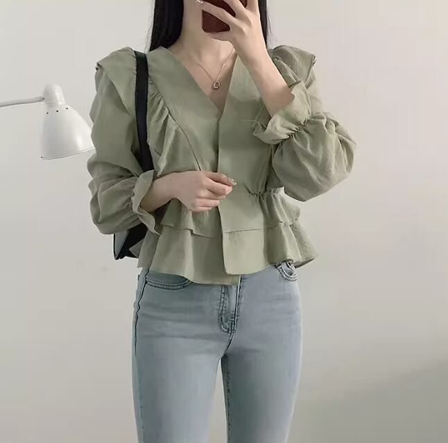 レディース トップス シャツ ブラウス ショート 長袖 フリル袖 Vネック フェミニン ウエストマーク 薄手 かわいい 大人可愛い きれいめ カジュアル 上品 おしゃれ ルーズ 主役級 存在感 ラブリー ロマンティック ナチュラル 無地 秋 OL 学生 デート お出かけ リゾート 旅行 レストラン 女子会 休日 ホテル ショッピング 合コン コンパ カフェ 婚活 韓国 オルチャン 体型カバー 普段使い 着回し 清楚 インスタ映え S M L XL アプリコット グリーン