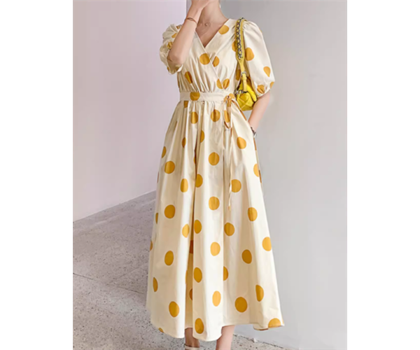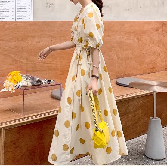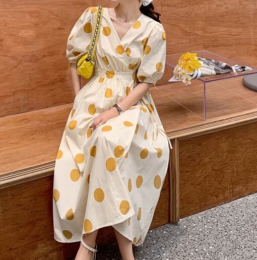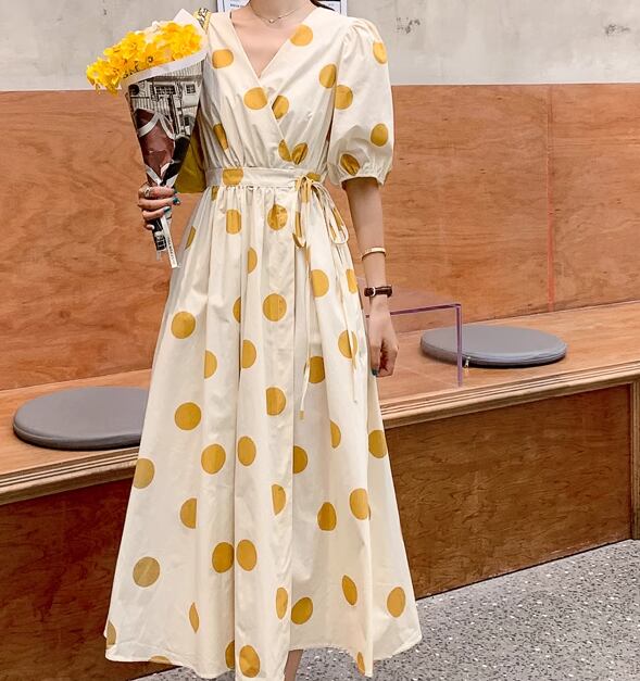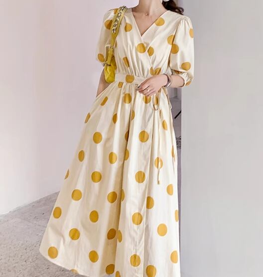 レディース ワンピース ロング 半袖 Vネック カシュクール フレア フェミニン ウエストマーク ウエストリボン かわいい カジュアル 上品 おしゃれ レトロ ガーリー 個性的 主役級 存在感 ラブリー キュート 高級感 華やか フェアリー ドット柄 水玉 夏 デート お出かけ 普段使い S M L ブラック イエロー