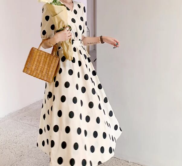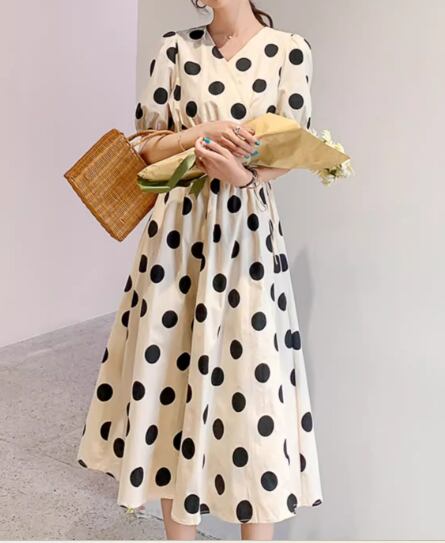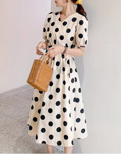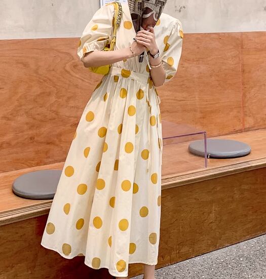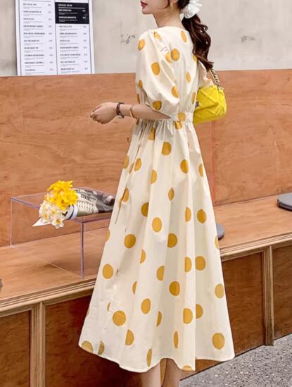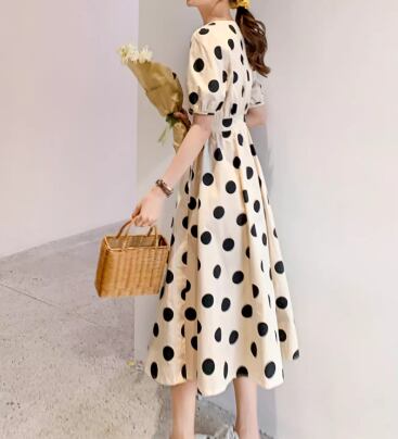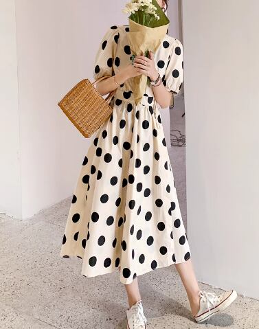 まるで昭和の世界からタイムスリップしたかのような、レトロで可愛いデザインが魅力的な半袖の水玉ワンピース。