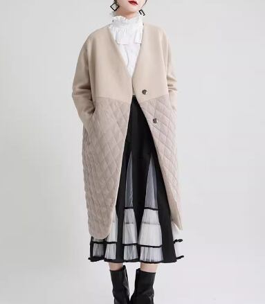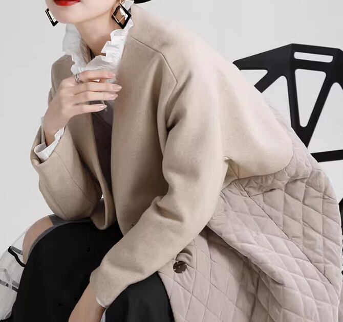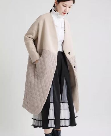 レディース コート アウター 上着 ウール ロング ミドル丈 長袖 Vネック ストレート ポケット ボタン 切り替えデザイン ドッキング コットン 大人可愛い シンプル カジュアル 上品 おしゃれ ルーズ 個性的 クール モダン 存在感 キュート ラグジュアリー ナチュラル シック 高級感 芸術的 アーティスティック スタイリッシュ 無地 冬 デート お出かけ 普段使い 着回し トレンド 流行 M L ゆったり ゆる 大きめ オーバーサイズ ブラック アプリコット