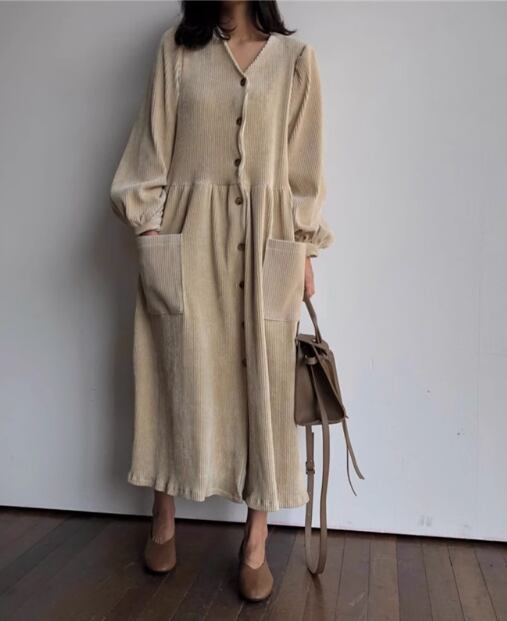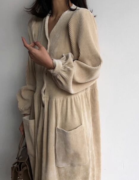 フェミニンな雰囲気漂う、ゆったりとしたコーデュロイワンピース。長いシーズン楽しめるロング丈で、大人可愛い雰囲気を演出します。ボリュームたっぷりの袖やウエストの切り替えデザインが、着るだけでおしゃれな印象に。さらに、シンプルながらもこなれ感のあるデザインは、カジュアルからデートまで幅広いシーンに対応。コーデュロイのとろみ感や抜け感が、季節感を演出し、秋のファッションを楽しめます。