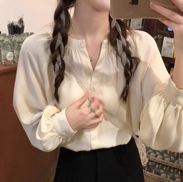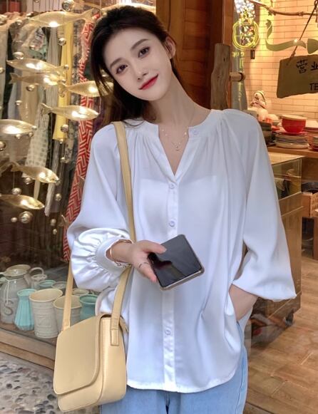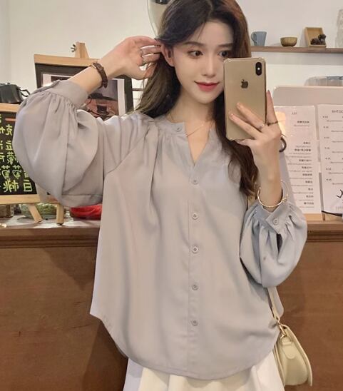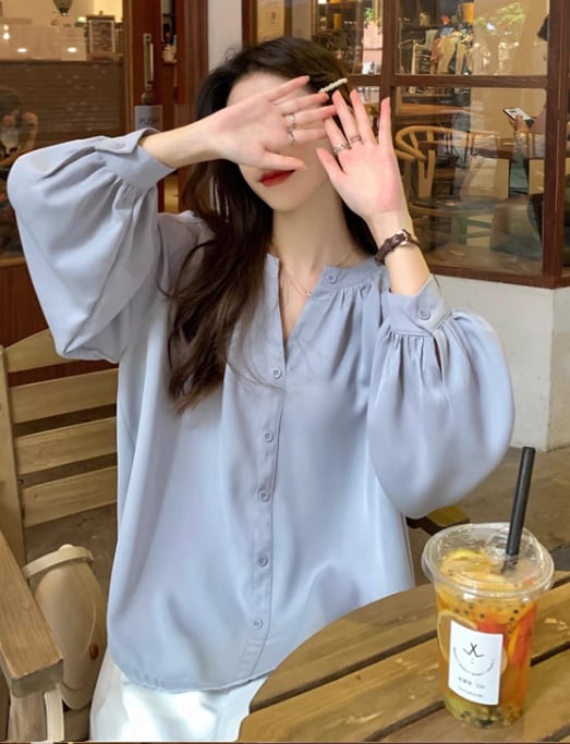 レディース トップス シャツ ブラウス 長袖 ボリューム袖 Vネック 襟なし 薄手 かわいい 大人可愛い きれいめ シンプル カジュアル 上品 おしゃれ ガーリー 無地 春 夏 オフィス ビジネス 通勤 デート お出かけ 韓国 オルチャン コーデ 普段使い モテ 清楚 フリーサイズ 白 クリーム ブルー