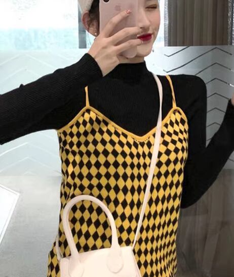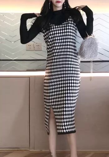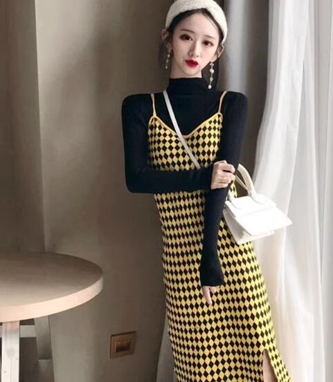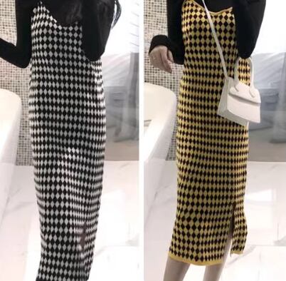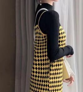 二点セット レディース スカート トップス ニット オールインワン ロング 袖なし タイト スリム ストレート ニット リブニット かわいい 大人可愛い カジュアル おしゃれ かっこいい レトロ エキゾチック こなれ感 格子柄 千鳥格子 秋 冬 学生 学校 デート お出かけ 韓国 オルチャン コーデ 美脚 脚長 普段使い 着回し モテ S M L XL 黒 ブラック 黄色 イエロー
