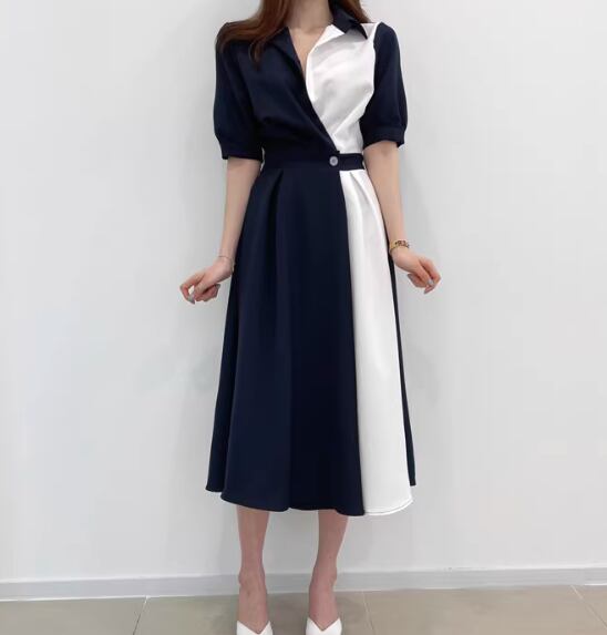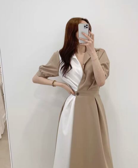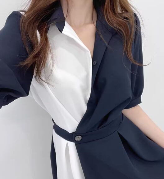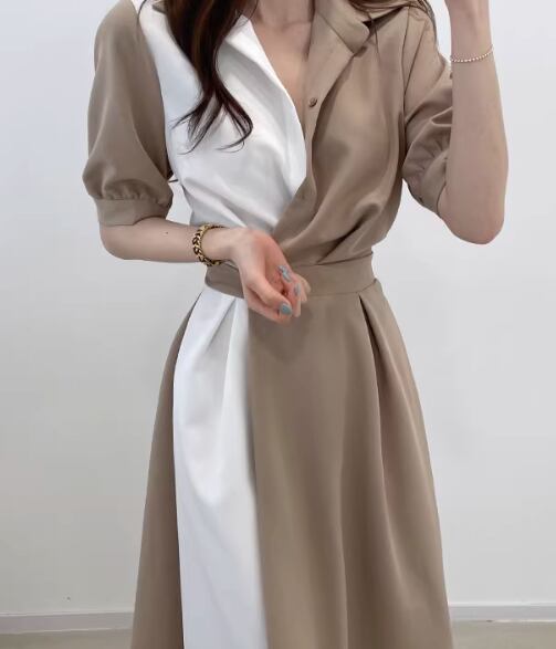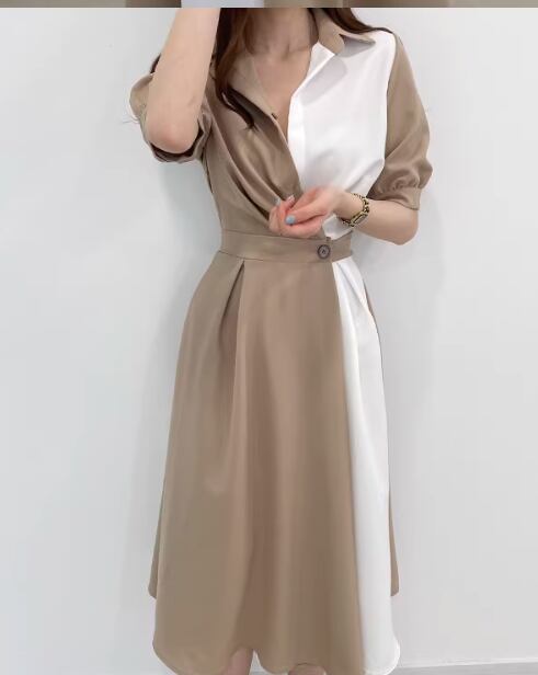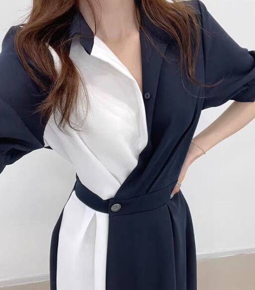 左右非対称のバイカラーシャツワンピース。Vネックとフレアスカートが女性らしい印象を演出し、シンプルで上品なデザインがおしゃれさを引き立てます。シャツのような襟付きでフォーマルな場面からカジュアルなデートまで幅広く活躍します。