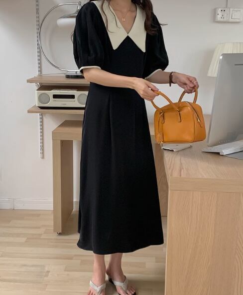 レディース ワンピース シャツワンピ ロング 半袖 5分袖 バルーン袖 Vネック 襟付き ストレート 切り替え ウエストマーク ウエストリボン 切り替えデザイン バイカラー 配色 かわいい きれいめ シンプル 上品 レトロ クール エレガント とろみ感 抜け感 ナチュラル 無地 春 秋 10代 20代 30代 デート お出かけ 韓国 オルチャン コーデ 楽ちん 体型カバー 美脚 脚長 プチプラ 普段使い モテ 清楚 ゆったり ゆる フリーサイズ 黒 ブラック ベージュ