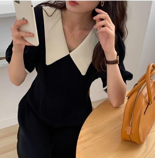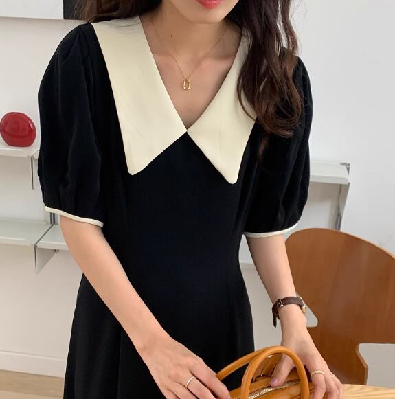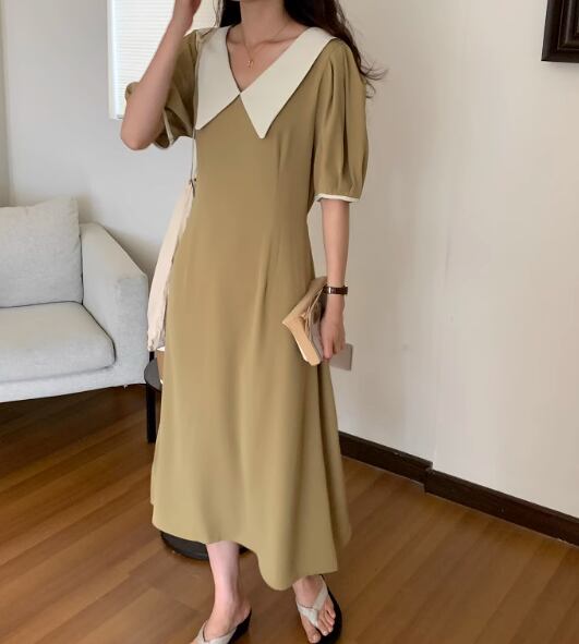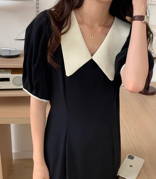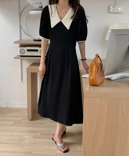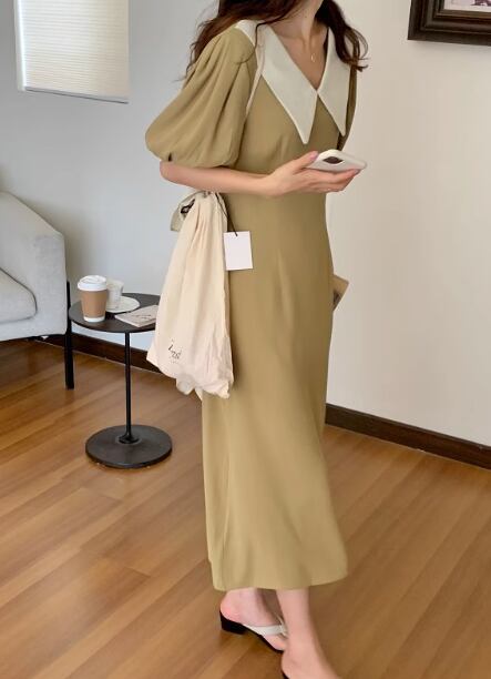 エレガントで上品なレディースワンピースが新登場しました!Vネックに大きな襟がキュートな印象を与えるデザインで、女性らしさを引き立てます。ウエストマークでスタイルアップ効果も抜群で、着るだけで簡単に美脚効果が期待できます。バルーン袖がおしゃれなアクセントとなり、女性らしい雰囲気を演出してくれます。