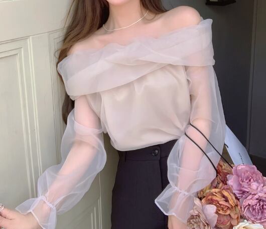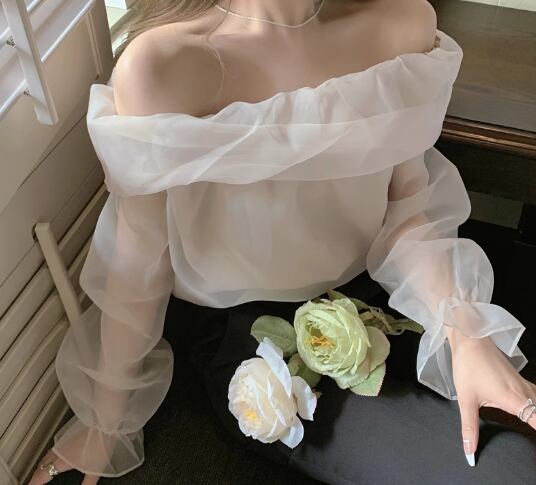 レディース トップス プルオーバー 長袖 パフスリーブ フリル袖 オフショルダー フェミニン レース シフォン フリル ふっくら 透け感 シースルー 肌見せ 薄手 シアー ナイロン メッシュ かわいい 上品 ガーリー エレガント 存在感 ラブリー キュート ロマンティック 華やか 無地 オールシーズン デート 海 女子会 合コン モテ S M L ホワイト