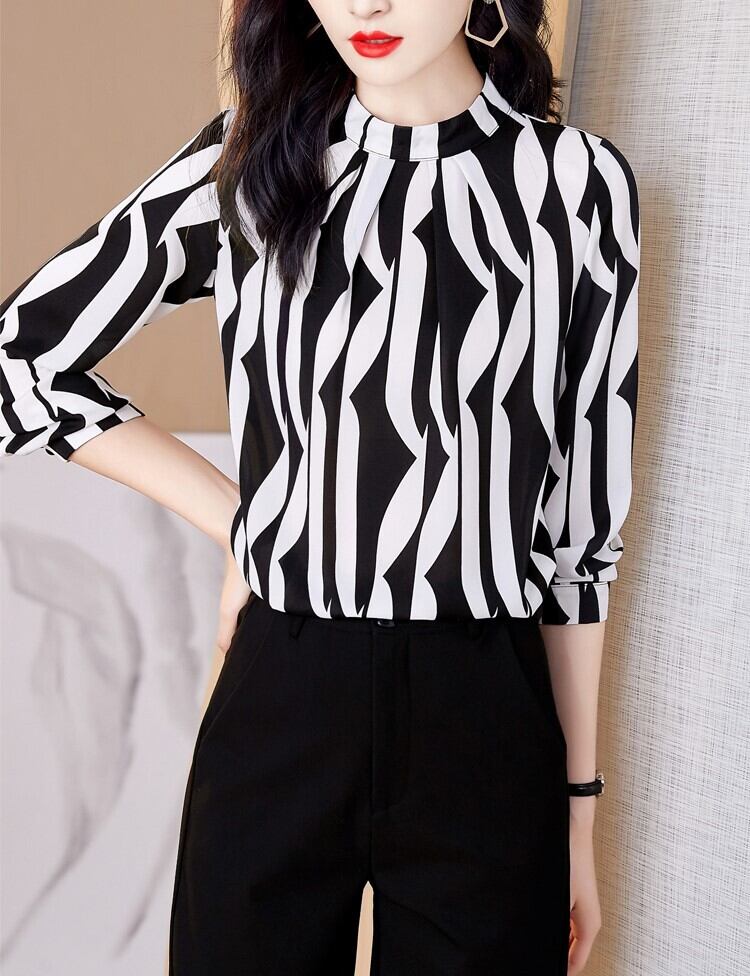 変形ストライプパターン 幾何学調 首元タック レディース トップス ブラウス ミディアム丈 九分袖 長袖 プチハイネック 襟付き スタンドカラー シフォン きれいめ シンプル 上品 おしゃれ かっこいい こなれ感 クール モード系 モダン 大人っぽい スタイリッシュ 総柄 プリント 春 秋 会議 ミーティング プレゼン ママ オフィス OL 通勤 デート お出かけ レストラン ホテル 体型カバー ジャケットイン S M L XL 2XL 大きいサイズ ぽっちゃり グラマー ゆったり ブラック モノトーン