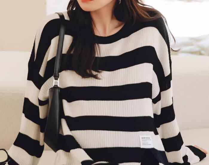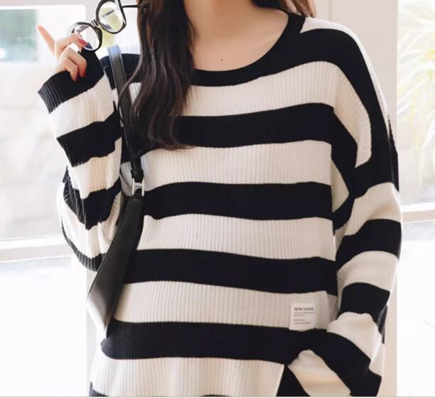 ブラック×ホワイトのモノトーンカラーなボーダーが大人可愛い妊婦さん用のニットセーター。