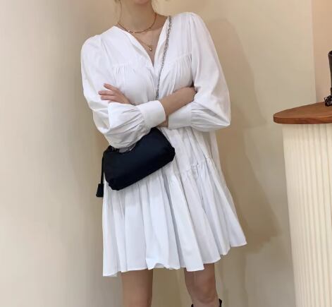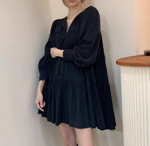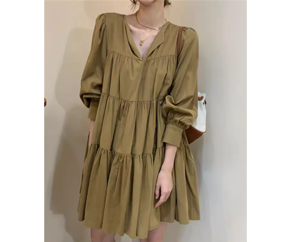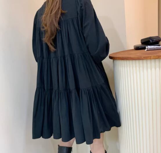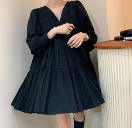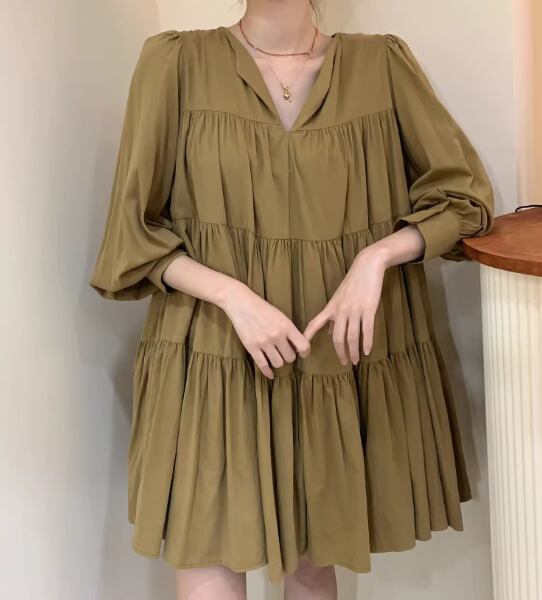 レディース ワンピース プルオーバー ミニ ショート 膝上 ミドル丈 長袖 Vネック Aライン ティアード プリーツ 大人可愛い シンプル カジュアル おしゃれ レトロ ラフ ガーリー ルーズ 個性的 存在感 キュート ナチュラル リラックス シック 優しい 穏やか フェアリー 無地 秋 デート お出かけ 楽ちん 体型カバー 普段使い ゆったり フリーサイズ ホワイト ブラック カーキ