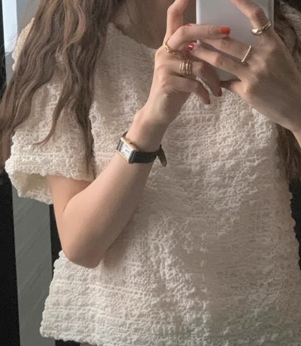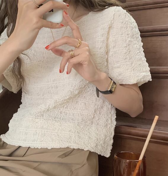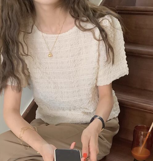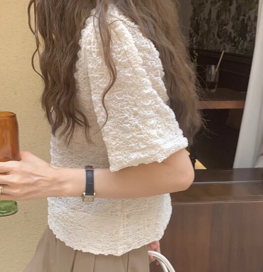 ラウンドネックで襟なしのシンプルなデザインながらも、存在感抜群の半袖シャツです。薄手で涼しげな着心地が夏にぴったり。大人可愛い上品さと個性的なエレガンスを兼ね備え、どんなシーンでも主役級の存在感を放ちます。