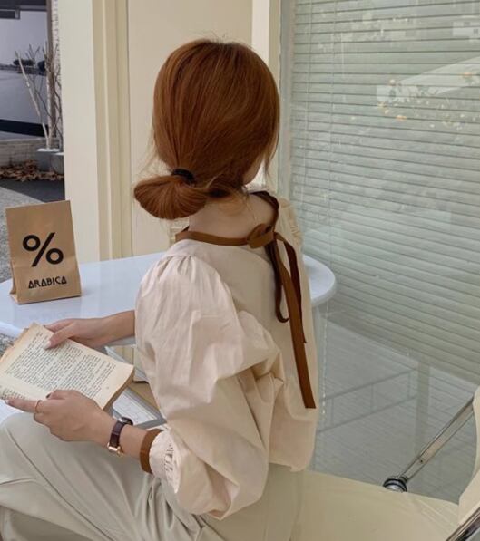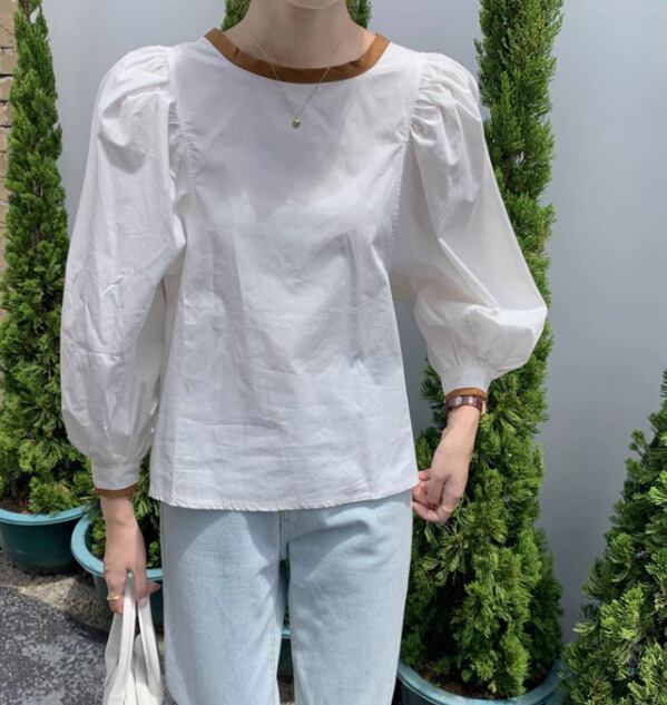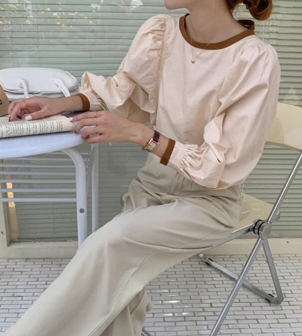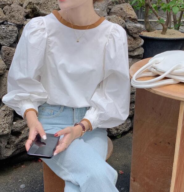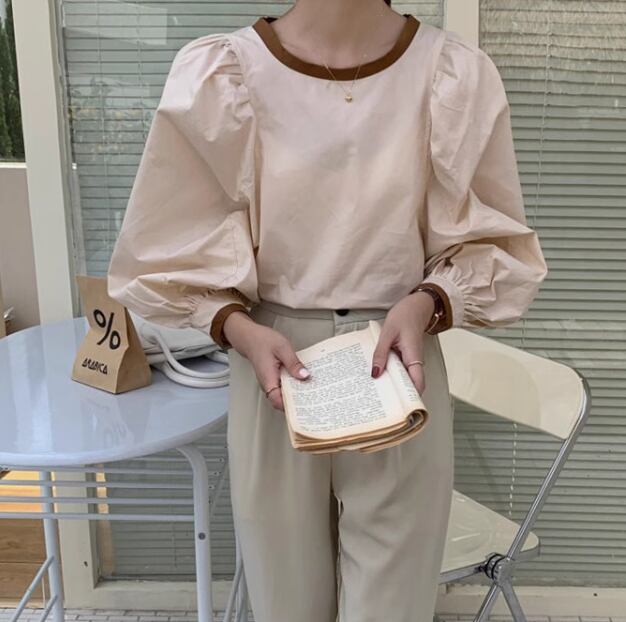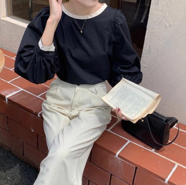 レディース トップス シャツ ブラウス ボリューム袖 Uネック 切り替え バイカラー 配色 薄手 かわいい 大人可愛い きれいめ シンプル カジュアル おしゃれ ラブリー キュート カレッジ風 学生風 無地 春 秋 10代 20代 学生 学校 通学 デート お出かけ 韓国 オルチャン プチプラ 普段使い 着回し レイヤード モテ 清楚 S M L XL