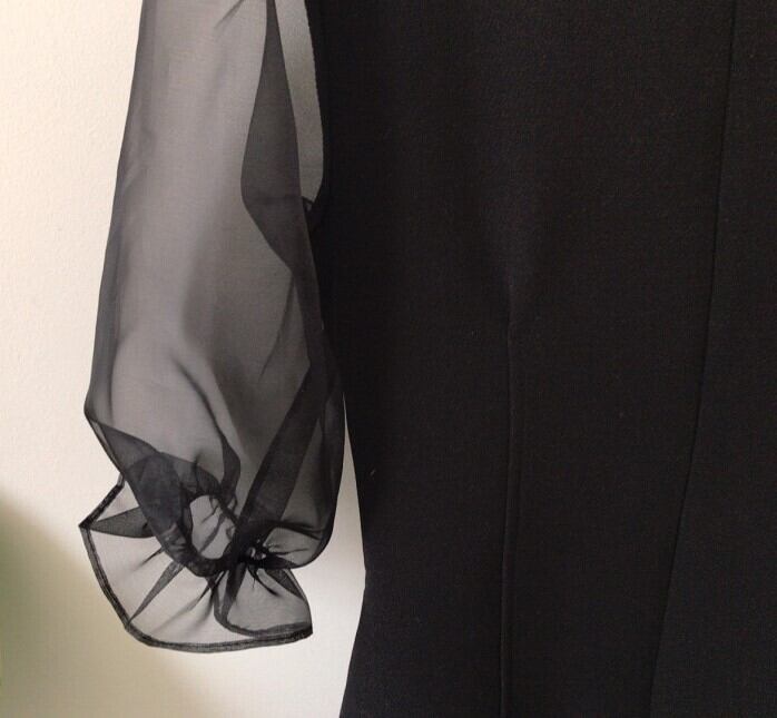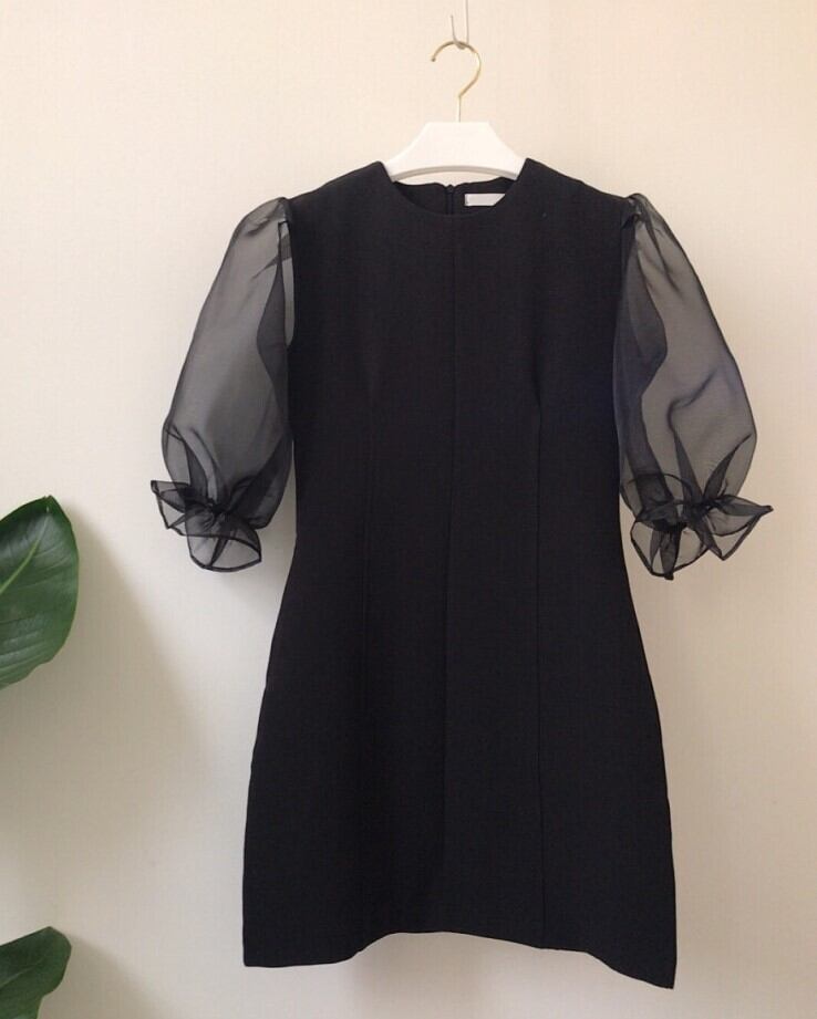 袖シアー ふんわり袖 レディース ワンピース ドレス ミニ 膝上 5分袖 ボリューム袖 パフスリーブ クルーネック 襟なし タイト スリム 細身 ハイウエスト 透け感 シースルー 切り替えデザイン バックファスナー ウエストシェイプ 異素材ミックス かわいい 大人可愛い きれいめ シンプル 上品 おしゃれ 存在感 抜け感 フェミニン セクシー 女っぽ 無地 春 夏 秋 ハロウィン 女の子 パーティー イベント 韓国 オルチャン コーデ 脚長 インスタ映え S M L すっきり 黒 ブラック モノトーン