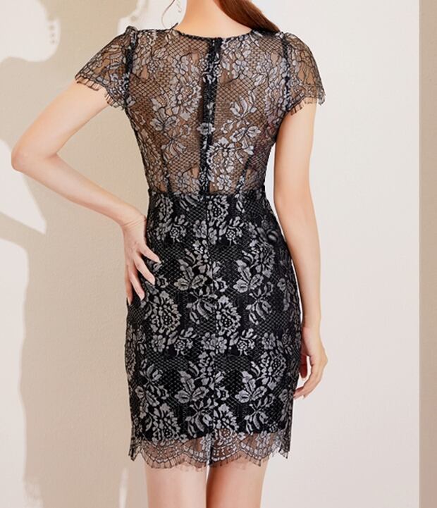 レディース ドレス パーティードレス ブラックドレス パーティー 結婚式 二次会 披露宴 ショート 長袖 ラウンドネック スレンダー タイト スリム レース 刺繍 ファスナー 透け感 シースルー きれいめ 上品 クール エレガント 主役級 存在感 フォーマル ゴージャス エレガント セクシー 華やか 高級感 花柄 パーティー 二の腕カバー 美脚 シーズンレス S L XL シルバー ブラック