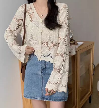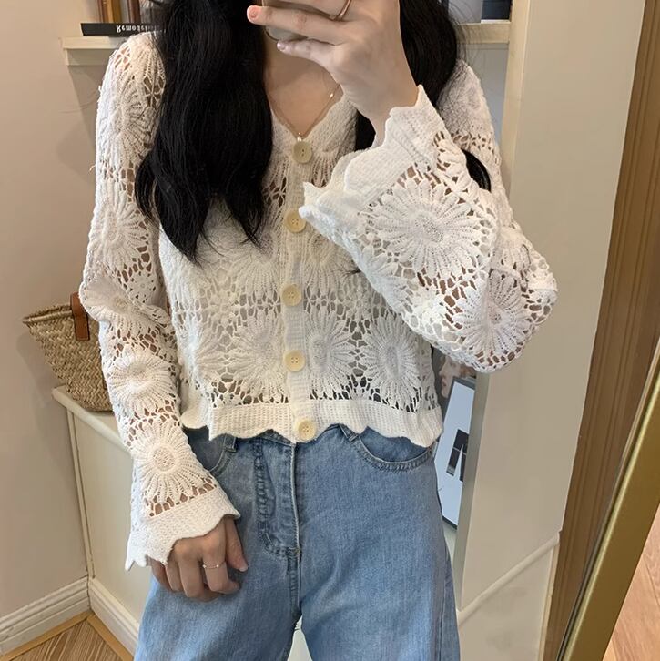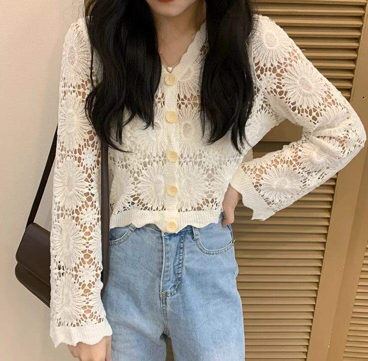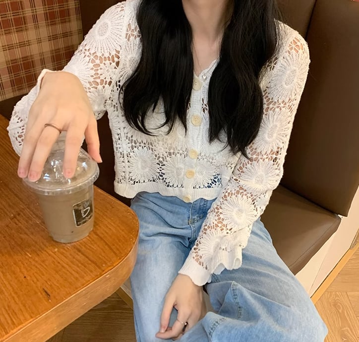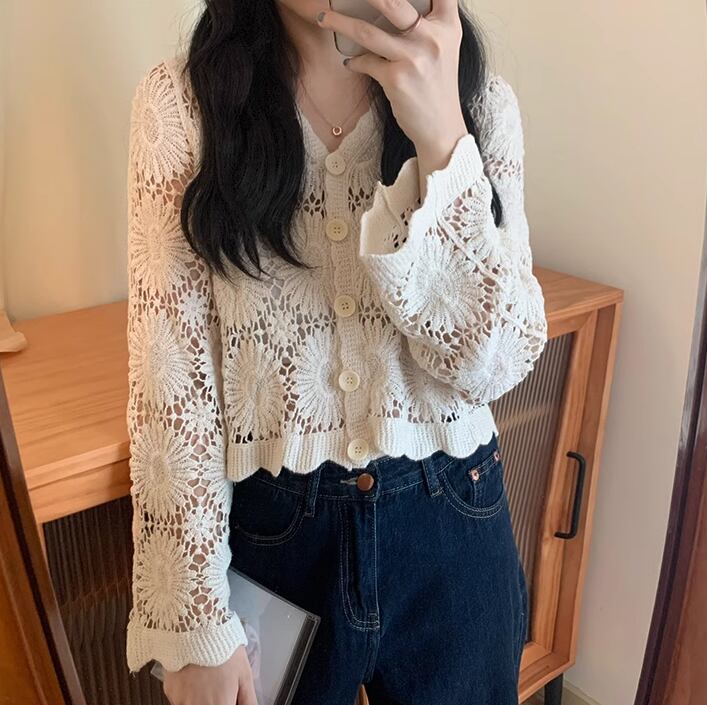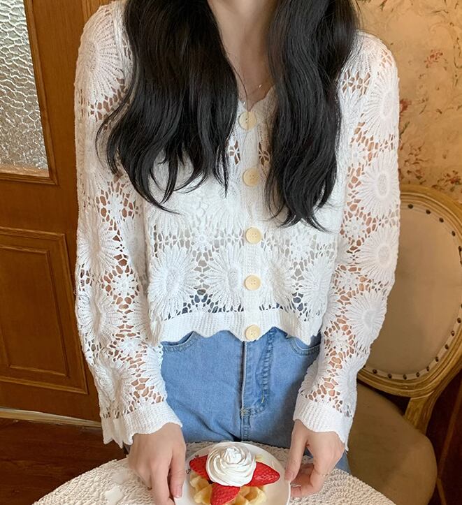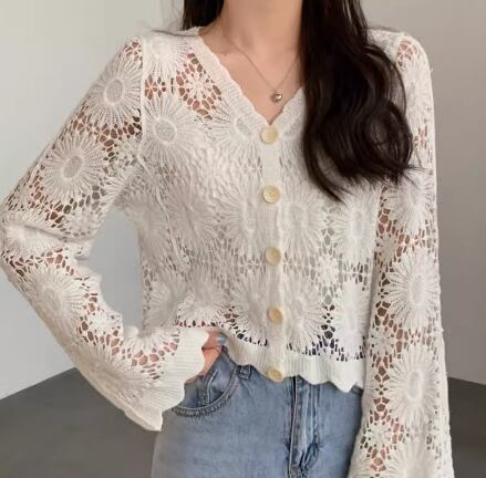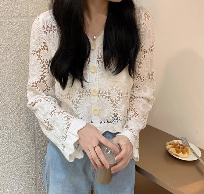 レディース トップス カーディガン ショート丈 長袖 フレアスリーブ 袖あり Vネック 襟なし レース 前開き 編み込み ボタン かわいい 大人可愛い シンプル カジュアル おしゃれ レトロ アジアン ラフ 主役級 存在感 花柄 フラワー 柄 春 夏 秋 女性用 10代 20代 通勤 デート お出かけ イベント リゾート 旅行 海 レストラン ビーチ 公園 女子会 休日 バカンス ガーデン ショッピング カフェ 重ね着 普段使い 着回し モテ フリーサイズ 白 ホワイト オフホワイト カラバリ