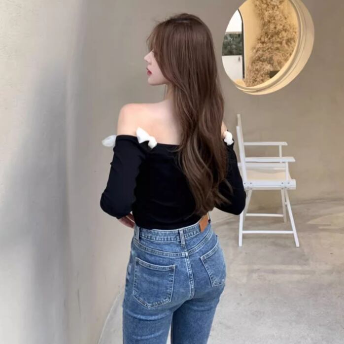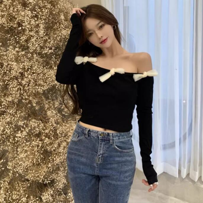レディース トップス ロンT プルオーバー 長袖 萌袖 オフショルダー スリム 細身 スマート フェミニン リボン 伸縮性 薄手 かわいい 大人可愛い きれいめ シンプル カジュアル 上品 おしゃれ かっこいい レトロ こなれ感 ラフ 個性的 クール モード系 エレガント モダン 主役級 存在感 とろみ感 抜け感 ラブリー キュート 都会的 ロマンティック 無地 春 秋 デート お出かけ イベント リゾート 女子会 休日 バカンス ショッピング お花見 合コン コンパ コーデ モテ S M L ブラック