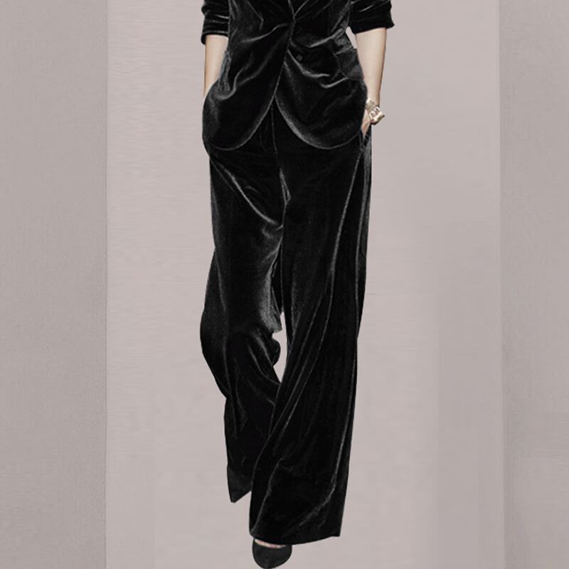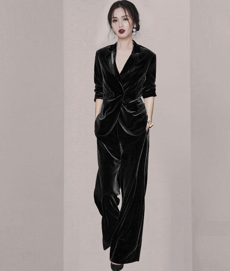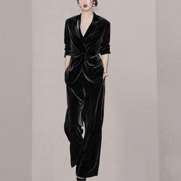 エレガントで存在感がある、ベルベット生地のテーラードジャケットとワイドレッグパンツの2点セットです。シンプルなデザインなので合わせるインナーやアクセサリーなどでクールにもゴージャスにも着回しができ、パーティーやイベント、結婚式や二次会など幅広いシーンで活躍します。