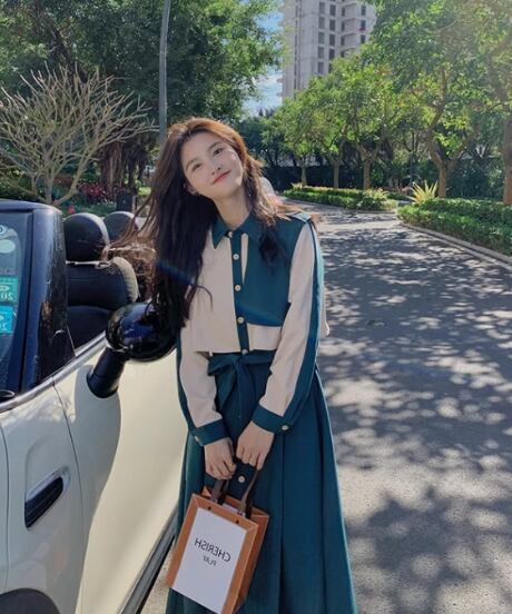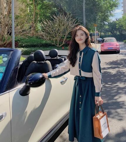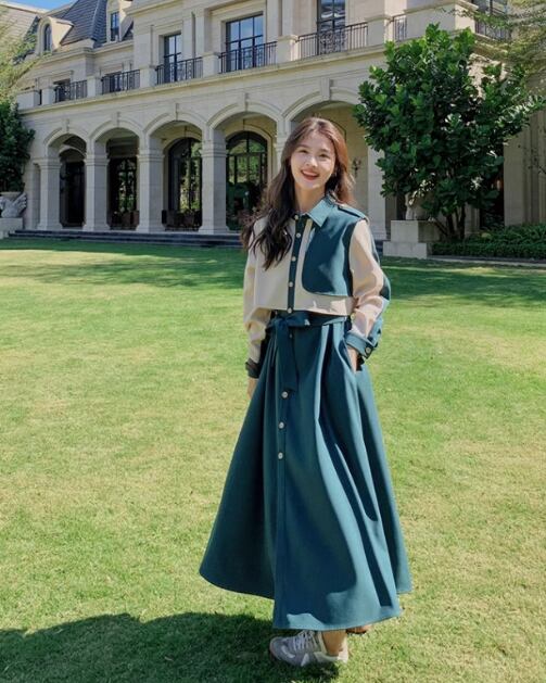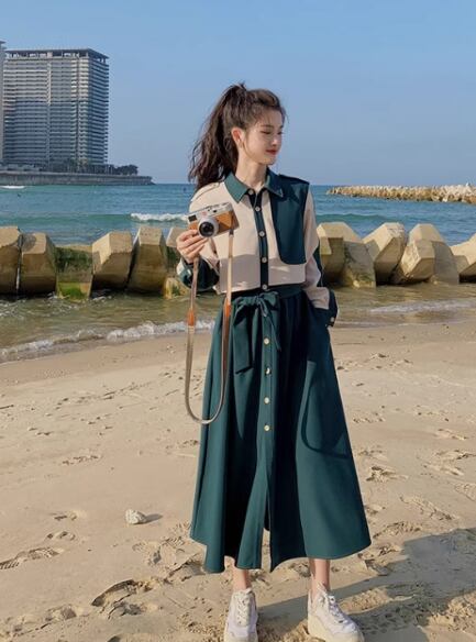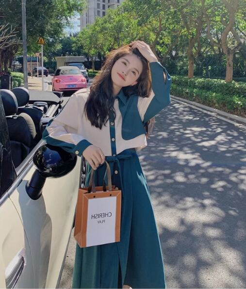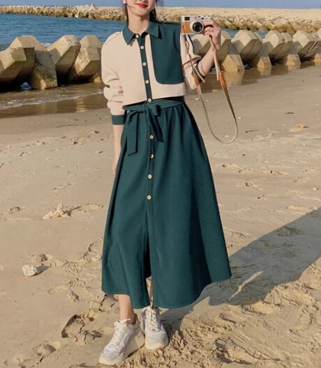 レディース ワンピース シャツワンピ 膝下 ロング 長袖 襟付き フレア 切り替え ボタン 切り替えデザイン バイカラー 配色 かわいい 大人可愛い シンプル カジュアル おしゃれ ガーリー エレガント ラブリー キュート 清潔感 爽やか 無地 秋 学生 学校 デート お出かけ 公園 女子会 休日 韓国 オルチャン モテ 清楚 S M L XL