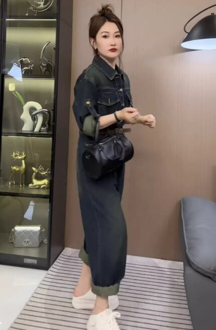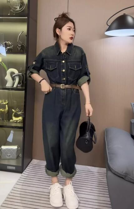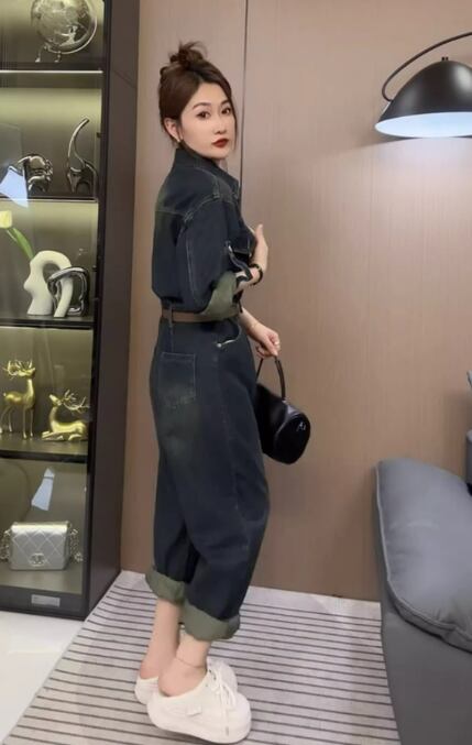 レディース パンツ オールインワン 長袖 襟付き ベルト ウエストマーク デニム ブルーデニム かわいい 大人可愛い シンプル カジュアル おしゃれ かっこいい こなれ感 ラフ クール カントリー 無地 春 秋 学生 学校 公園 休日 韓国 オルチャン コーデ 体型カバー 美脚 脚長 普段使い L XL 2XL 3XL 大きいサイズ ビッグ 大きめ