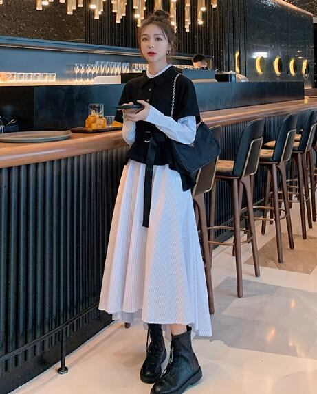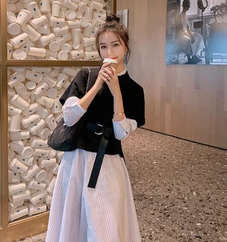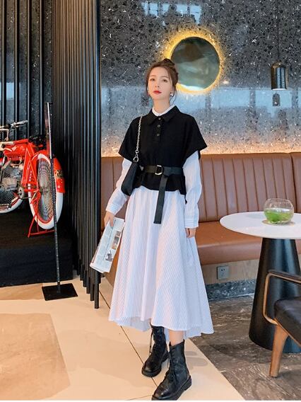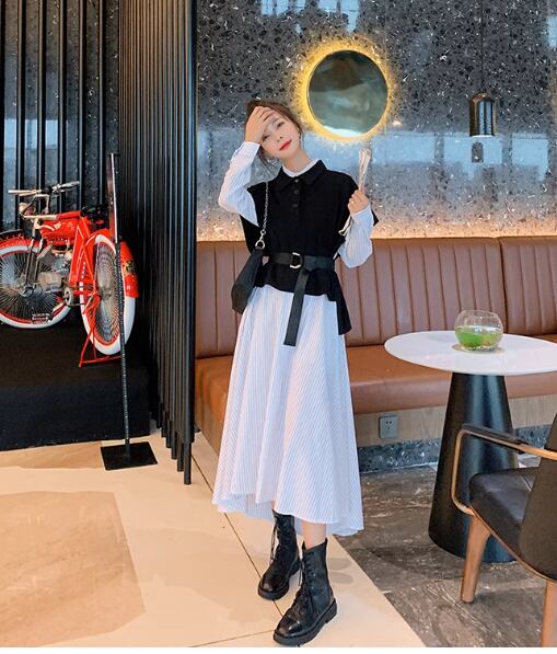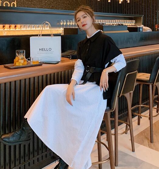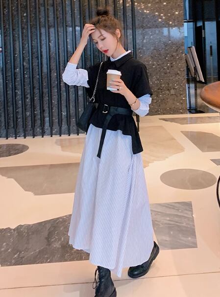 二点セット レディース トップス ワンピース シャツワンピ 膝下 ロング マキシ 長袖 襟付き フレア Aライン かわいい 大人可愛い きれいめ シンプル カジュアル 上品 かっこいい こなれ感 ラフ ガーリー とろみ感 ラブリー キュート ナチュラル ストライプ 春 秋 10代 20代 30代 学校 デート お出かけ 公園 女子会 休日 バカンス 韓国 オルチャン コーデ 楽ちん 体型カバー 美脚 脚長 普段使い 着回し モテ 清楚 トレンド 流行 定番 S M L XL 白 ホワイト 黒 ブラック