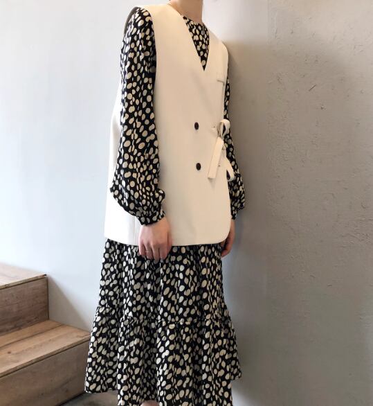 スリムなウエストラインを演出するVネックの袖なしトップスが新登場!ダブルボタンのデザインがおしゃれなアクセントになっています。スリット付きで動きやすく、前開き仕様で着脱もしやすいのが嬉しいポイント。ポケットも付いていて機能性もバツグン!大人可愛い雰囲気漂うデザインは、オフィスはもちろんデートや女子会、休日の公園散歩まで幅広く活躍します。
