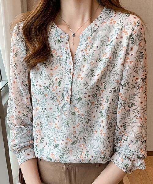 レディース トップス ブラウス プルオーバー ミドル丈 長袖 萌袖 Vネック 襟なし スリム 細身 シフォン 大人可愛い 上品 ガーリー キュート ロマンティック ナチュラル 爽やか 華やか 優しい 花柄 プリント 小花柄 春 夏 デート お出かけ 女子会 お花見 普段使い モテ S M L XL 2XL 春カラー