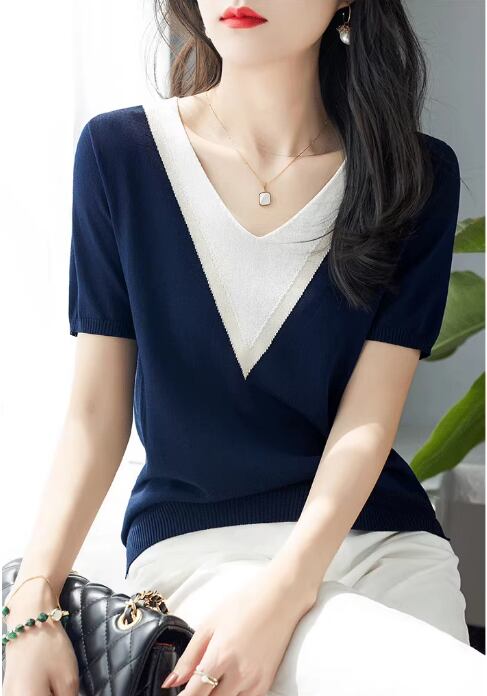レディース トップス カットソー ニット プルオーバー 半袖 Uネック ラウンドネック 襟なし ストレート フェミニン 切り替えデザイン バイカラー 配色 大人可愛い きれいめ シンプル カジュアル 上品 おしゃれ 主役級 存在感 抜け感 無地 春 夏 秋 デート お出かけ 旅行 レストラン 公園 女子会 休日 ホテル ショッピング カフェ 重ね着 オルチャン コーデ 普段使い 着回し M L XL 2XL 黒 ブラック 紺 ネイビー