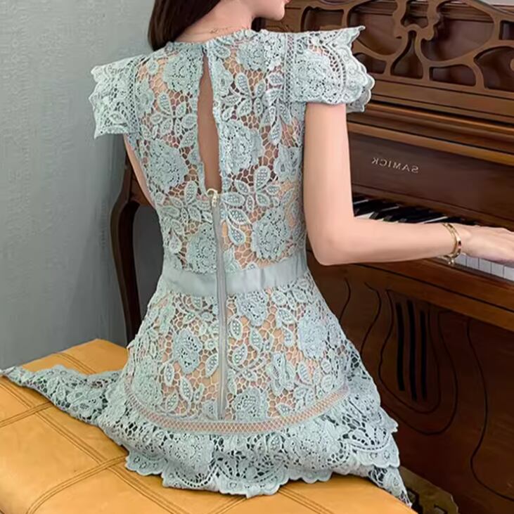 全身にあしらわれたレースとフリルが華やかで上品な半袖ドレスです。