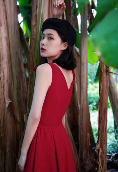 ノースリーブで襟もない、Aラインのシルエットが女性らしさを際立たせます。