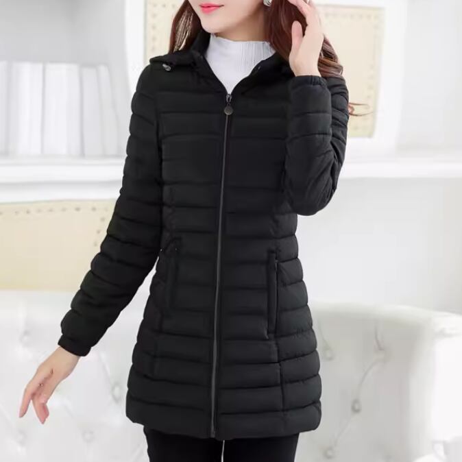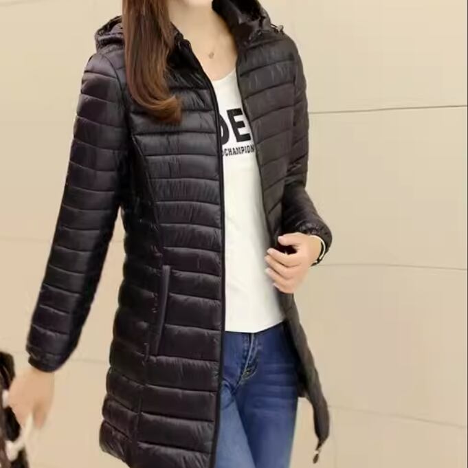 スリムなシルエットが魅力のフード付きダウンコート