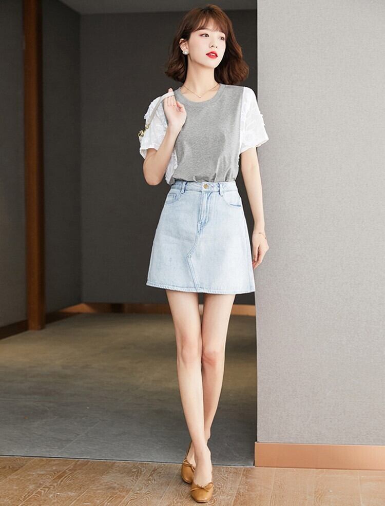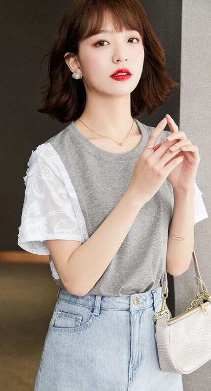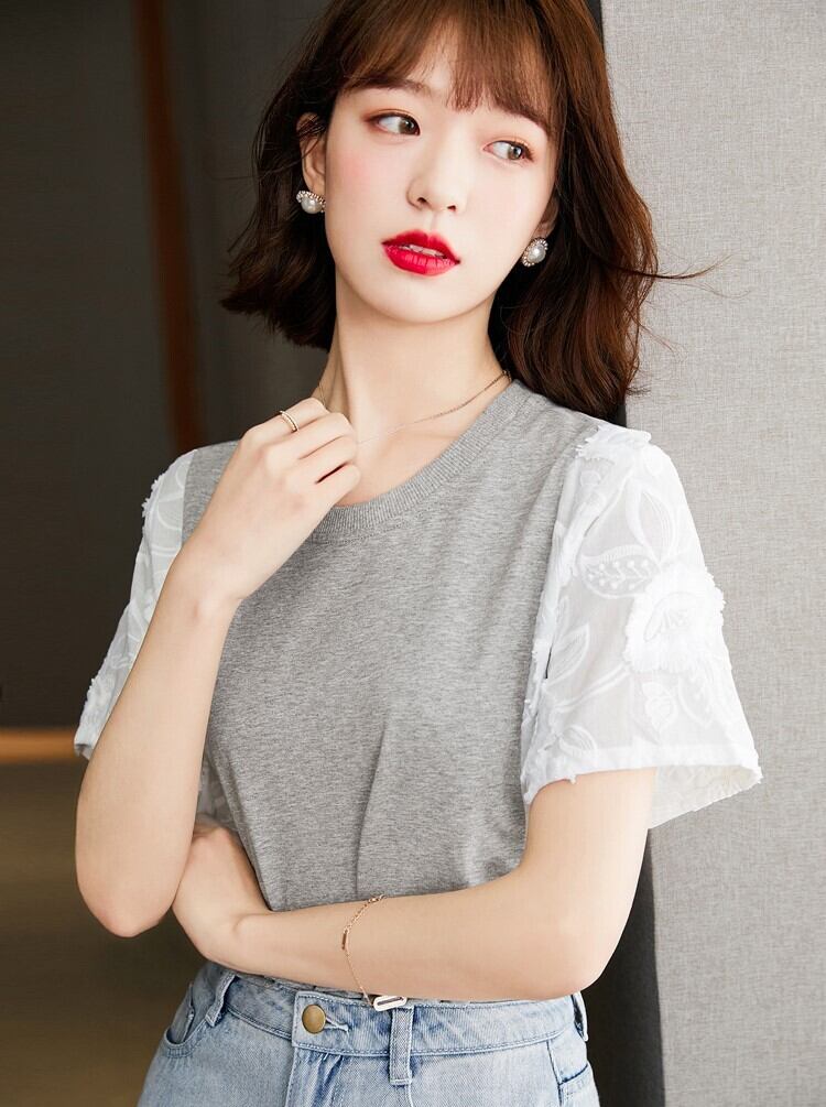 レディース トップス カットソー 半袖 ラウンドネック 襟なし ストレート 切り替え ドッキング フェミニン レース 刺繍 切り替えデザイン ポリエステル 配色 かわいい 大人可愛い きれいめ シンプル カジュアル おしゃれ こなれ感 主役級 存在感 抜け感 無地 春 夏 デート お出かけ リゾート 旅行 レストラン 公園 女子会 休日 お花見 カフェ お揃い 双子 韓国 オルチャン コーデ 普段使い 着回し S M L XL グレー
