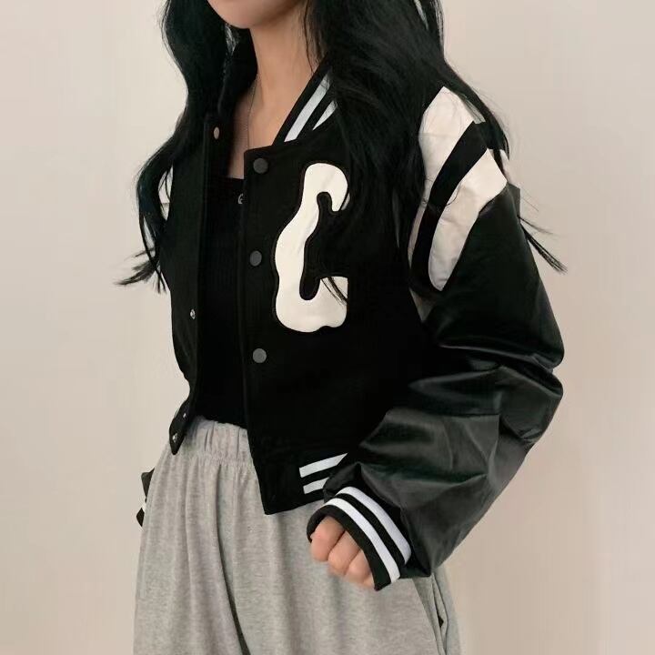 袖フェイクレザー クロップド スタジャン レディース アウター 上着 スタジアムジャンパー ショート 長袖 ドロップショルダー 襟付き ベースボールカラー オーバーサイズ 前開き 切り替えデザイン 配色2本ライン 胸ロゴ 異素材ミックス シンプル カジュアル おしゃれ かっこいい こなれ感 スポーティー 個性的 カレッジ風 無地 春 秋 ママ 女の子 学生 学校 通学 デート お出かけ 女子会 休日 オルチャン コーデ 脚長 普段使い 着回し インスタ映え S M L ゆったり 黒 ブラック モノトーン