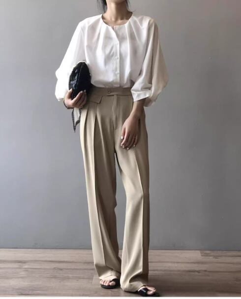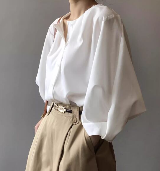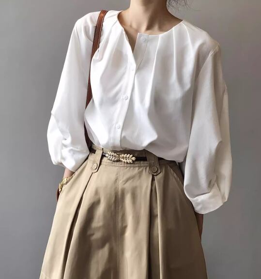 レディース トップス シャツ ブラウス 長袖 ボリューム袖 Uネック セミフレア オーバーサイズ タック 透け感 薄手 かわいい 大人可愛い シンプル カジュアル 上品 とろみ感 抜け感 無地 春 秋 20代 30代 40代 オフィス ビジネス 学生 学校 デート 女子会 休日 コーデ プチプラ 普段使い 着回し レイヤード モテ 清楚 トレンド M L 白 ホワイト ベージュ