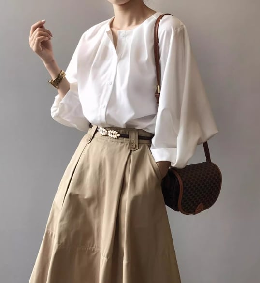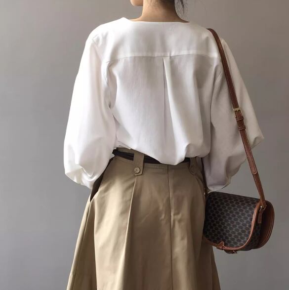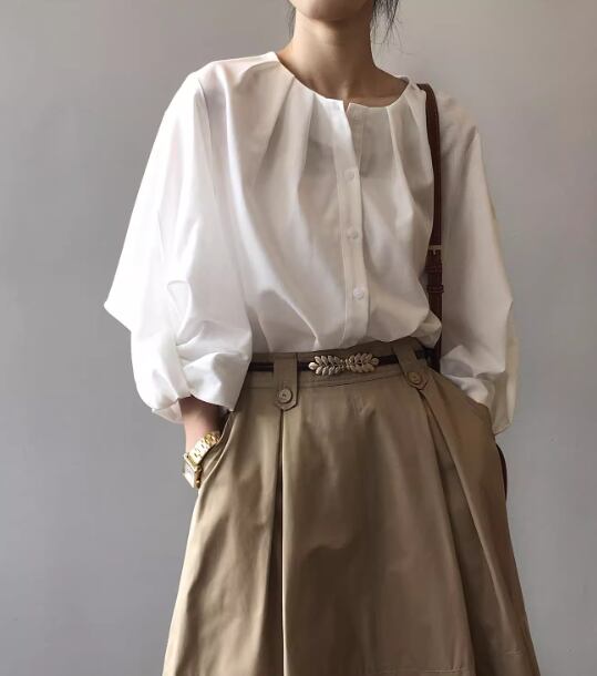 このかわいいフレアシャツは、Uネックとボリューム袖が特徴的なアイテム。セミフレアのシルエットが女性らしさを引き立て、透け感のある薄手の素材が上品な印象を与えます。オーバーサイズで着心地も抜群で、タックデザインでトレンド感も取り入れられています。