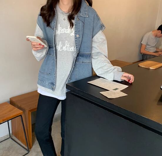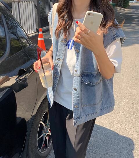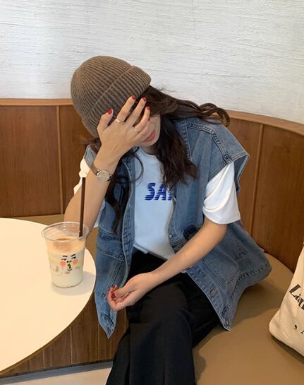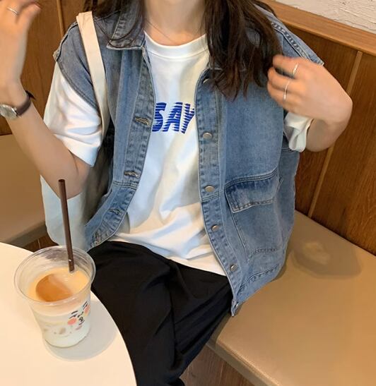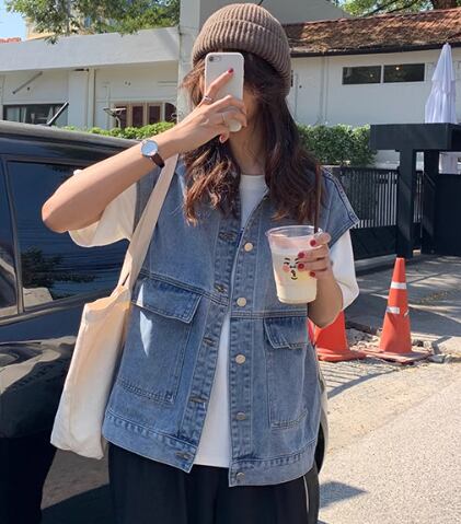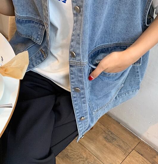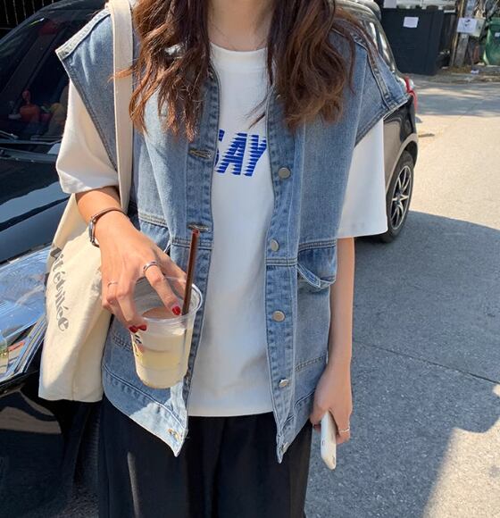 レディース トップス ジャケット ベスト 袖なし ノースリーブ 襟付き ポケット 前開き ボタン デニム ブルーデニム かわいい 大人可愛い シンプル カジュアル おしゃれ かっこいい マニッシュ ボーイッシュ モード系 エレガント 学生風 ベーシック 無地 春 秋 10代 20代 通勤 学生 学校 デート お出かけ 女子会 休日 韓国 オルチャン コーデ 楽ちん 体型カバー 普段使い 着回し レイヤード モテ 清楚 トレンド 流行 定番 ゆったり ゆる フリーサイズ