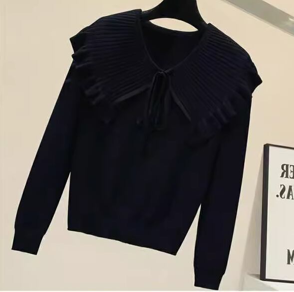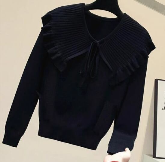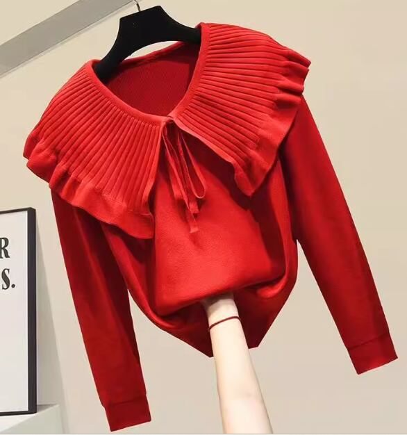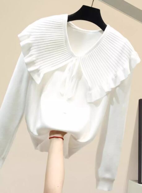 レディース トップス カットソー ニット セーター プルオーバー ミドル丈 長袖 襟付き ビッグカラー ストレート フェミニン プリーツ フリル リボン かわいい きれいめ シンプル カジュアル 上品 おしゃれ レトロ ガーリー 個性的 ラブリー キュート 華やか 優しい 穏やか フェアリー 柔らかい 無地 春 秋 デート お出かけ 普段使い 着回し 清楚 S M L XL ホワイト ブラック レッド