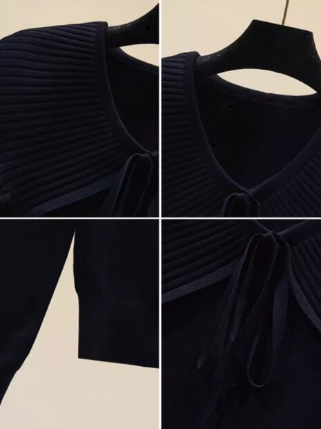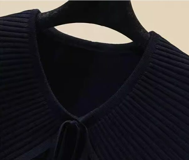 大きめの襟と胸元のリボンがアクセントになったフェミニンな雰囲気のニットソー。