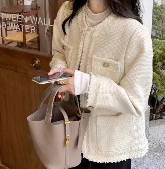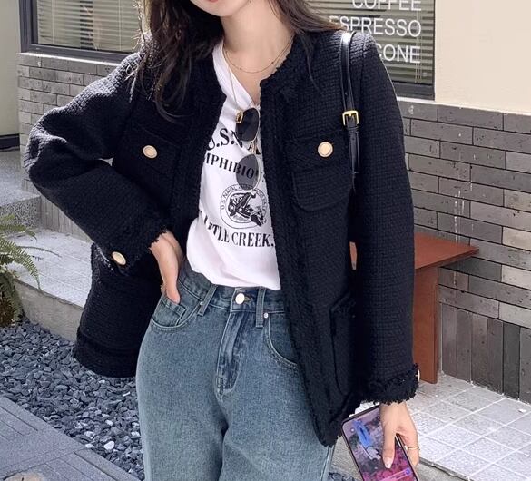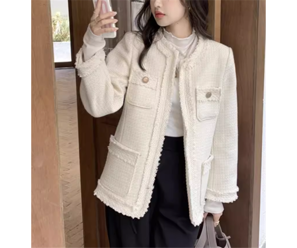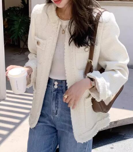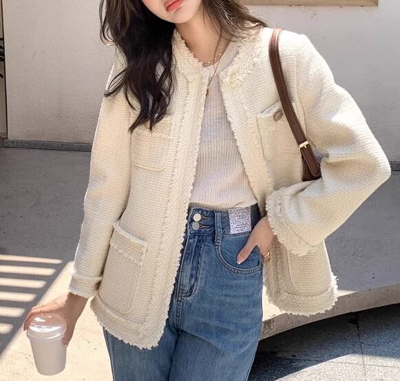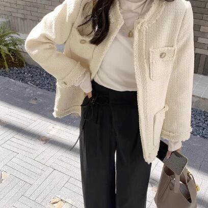 レディース ジャケット アウター 上着 羽織 前開き ノーカラージャケット ミドル丈 長袖 ラウンドネック ノーカラー ストレート 異国風 ツイード フリンジ 大人可愛い きれいめ シンプル 上品 おしゃれ レトロ こなれ感 クール エレガント クラシカル 知的 ハンサム シック 高級感 スタイリッシュ 無地 春 秋 冬 デート お出かけ 普段使い 着回し S M L ブラック オフホワイト