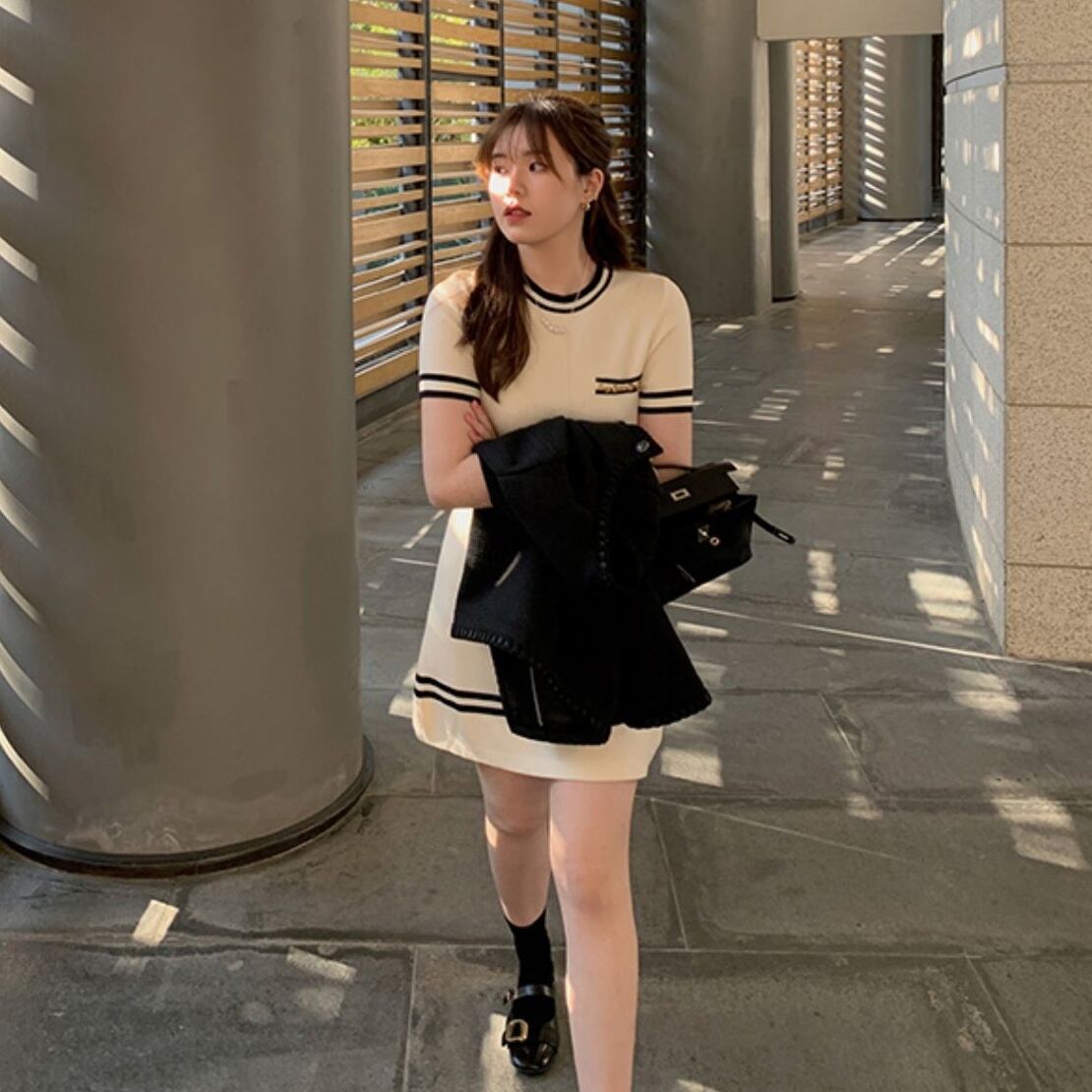 バイカラーのラインがアクセントのミニ丈ニットワンピース。