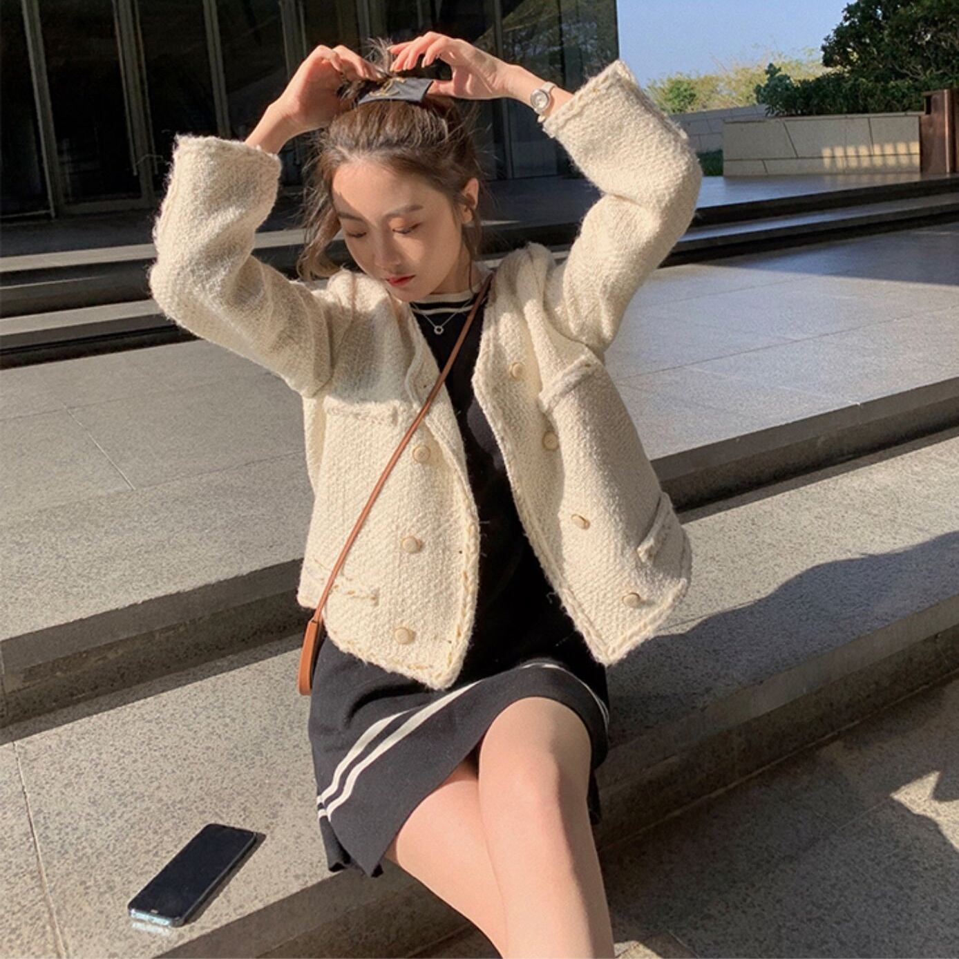 胸元のゴールドチェーンがコーデを華やかにしてくれます。デイリー使いからデート、お呼ばれなど様々なシーンで活躍します。ミニ丈なので脚長効果も期待できそう。