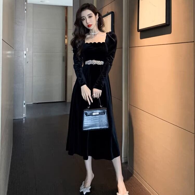 レディース ワンピース ドレス フレア ミニ 膝下 ミモレ 長袖 スクエアネック Aライン ベルト ウエストマーク ハイウエスト 薄手 ベロア ベルト付き かわいい 大人可愛い きれいめ シンプル 上品 おしゃれ かっこいい こなれ感 ガーリー クール モード系 エレガント 主役級 存在感 フォーマル とろみ感 抜け感 ラブリー キュート 都会的 ラグジュアリー 無地 秋 冬 結婚式 二次会 クリスマス デート パーティー イベント レストラン ホテル 楽ちん モテ S M L XL 2XL ブラック